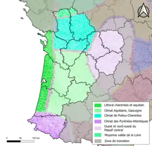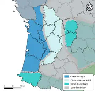 La région Nouvelle-Aquitaine est historiquement partagée entre plusieurs climats[5] :
