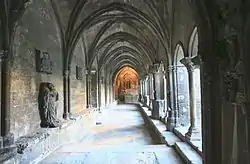 La galerie occidentale est datée du milieu du XVe siècle. Elle comprend sept travées séparées par des piliers identiques. Le programme iconographique est peu logique : lapidation de saint Étienne, Samson terrassant le lion, sainte Marthe et la tarasque, sainte Madeleine baisant les pieds du Christ et le couronnement de la Vierge.