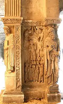 Les trois statues de saint Trophime, saint Pierre et saint Jean sont d’une qualité exceptionnelle et comptent parmi les plus admirables sculptures romanes de Provence[2]. Entre saint Jean et saint Trophime, un bas-relief représente le tombeau du Christ. Entre saint Pierre et Saint Trophime un autre bas-relief représente l’achat d’aromates par les saintes Maries pour embaumement du corps du Christ. Cet épisode est raconté dans l’évangile selon saint Marc : « Quand le sabbat fut passé, Marie de Magdala, Marie mère de Jacques et Salomé achetèrent des aromates pour aller oindre le corps (du Christ) » [3]. Les marchands sont représentés occupés à compter leurs pièces. Cette scène des marchands est assez rare, mais se remarque aussi sur les frises de Saint-Gilles et de Beaucaire.