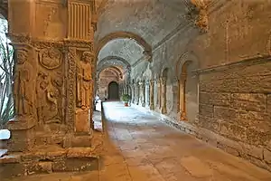 La galerie méridionale comprend six travées séparées par des piles alternativement minces et renforcées. Le programme iconographique est entièrement consacré au patron de la primatiale, saint Trophime. En effet les différentes scènes longtemps inexpliquées représentent les principaux épisodes du roman de saint Trophime, poème composé en 1221-1226[5] : Christ bénissant le cimetière des Alyscamps en présence de saint Trophime, et diverses épisodes d’un miracle : un jeune chevalier, coupable d’avoir giflé l’archevêque Turpin, est condamné à mort avec neuf de ses parents par Charlemagne. Toutes ces personnes sont pendues au gibet de Fourchon, mais grâce à l’intercession de saint Trophime, ils sont graciés par la main divine. Devant ce miracle Charlemagne pardonne.