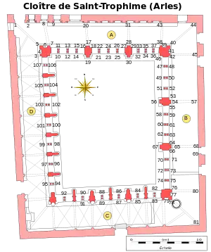 Légende du plan: 1-Bélier, 2-La luxure, 3-Saint-Jean, 4-Saintes femmes, 5-Saint Trophime, 6-Résurrection, 7-Saint Pierre, 10-Acanthes, têtes humaines et griffons, 11-Résurrection de Lazare, 12-Acanthes, 13-Sacrifice d'Abraham, 14-Acanthes, 15-Balaam, 16-Pèlerin d'Emmaüs, 17-Christ ressuscité, 18-Second pèlerin, 19-Contrefort, 20-Acrobate, 21-Acanthes, 22-Anges et Abraham, 23-Acanthes et têtes, 24-Saint Paul, 25-Acanthes, 26-Têtes d'hommes, de bélier et de griffon, 27-Saint Jacques le majeur, 28-Christ montrant ses plaies, 29- Saint Thomas, 30-Contrefort, 31-Aigle, 32-Acanthes, 33-Remise des tables de la Loi à Moïse, 34-Feuilles, 35-Acanthes, aigle et têtes humaines, 36-Acanthe, 37-Acanthe et têtes d'hommes, 38-Saint Paul, 39-Ascension, 40-Saint Étienne, 41-Lapidation de saint Étienne, 42-Saint André, 43-Âne, 44-Tarasque, 45-Décor végétal, 46-Contrefort, 47-Acanthes, 48-Annonciation, 49-Feuillage, 50-Aigles, 51-Feuillage, 52-Annonce aux bergers, 53-Judas, 54-Christ à la colonne, 55-Bourreau, 56-Contrefort, 57-Atlante, 58-Acanthes, 59-Hérode, 60-Mufle de lion et masque humain, 61-Fuite en Égypte, 62-Acanthe, 63-Mages devant Hérode, 64-Roi Salomon, 65-Statue disparue, 66-Reine de Saba, 67-Contrefort, 68-Tête de lion, 69-Blason à l'aigle, 70-Feuillage, 71-Adoration des Mages, 72-Cavalier Constantin, 73-Entrée du Christ à Jérusalem, 74-Acanthes, 75-Dispersion des apôtres, 76-Gamaliel, 77-Baiser de Judas, la Cène et le lavement des pieds, 78-Bénitier d'angle, 79-Baptême et tentation du Christ, 80-Ange, 81-Tête de bouc, 82-lion et tarasque, 83-Bénédiction des Alyscamps, 84-Feuillage, 85-Vierge et l'enfant, 86-Feuillage, 87-Charlemagne, 88-Masque, 89-Barons condamnés, 90-Feuillage, 91-Pendaison des barons, 92-Griffon et sirène, 93-Charlemagne et Turpin, 94-Feuillage, 95-Lapidation de saint Étienne, 96-Tête grotesque, 97-Samson, 98-Personnage et dragons, 99-Sainte Marthe, 100-Décor floral, 101-Madeleine, 102-Décor floral, 103-Annonciation, 104-Monstre, 105-Couronnement de la Vierge, 106- Lion, 107-Pentecôte.