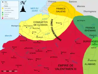 Avant l'avènement de Clodion, depuis 342 les Francs saliens sont installés comme fédérés à l'intérieur de l'Empire romain, dans le Nord de la Gaule, en Toxandrie[2], entre les marais mosans, au nord de l'actuelle Maastricht, et la forêt Charbonnière[3]. Depuis le , l'Empire romain est divisé en deux parties : l'Empire d'Orient et l'Empire d'Occident[4]. À partir de 407, plusieurs peuples germaniques pénètrent en Gaule et s'y installent. Les Wisigoths fondent un royaume en Aquitaine, les Alains (peuple non germanique) prennent leurs quartiers près d'Orléans, les Burgondes et les Alamans s'établissent le long du Rhin[5]. Durant le règne de Clodion, c'est Valentinien III qui dirige la partie occidentale de l'Empire romain[6].