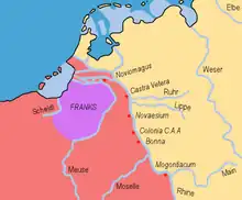 « Avec comme fortification romaine un lieu appelé aujourd'hui Duisbourg, sur la rive droite, ou quelque part au sud des Pays-Bas […]. Le roi des Francs profita probablement des troubles des années 432-435 pour sortir de Toxandrie et pour battre les lètes des garnisons de Tournai et de Cambrai. »