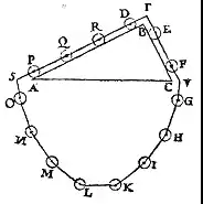 Stevin considère un triangle solide posé sur sa base horizontale en sorte que ses deux côtés forment deux plans inclinés, et il imagine qu'un chapelet formé de plusieurs poids égaux (clootcrans) enfilés à des distances égales ou plutôt une chaîne d'égale grosseur est placée sur les deux côtés de ce triangle, de manière que toute la partie inférieure pende librement au-dessous de sa base comme si elle était attachée aux deux extrémités de cette base[1]. Il suppose que la corde est sans poids et que le mouvement se réalise sans frottement.