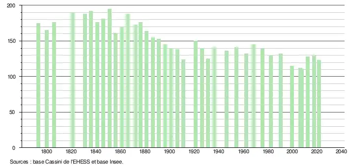 L'évolution du nombre d'habitants est connue à travers les recensements de la population effectués dans la commune depuis 1793. Pour les communes de moins de 10 000 habitants, une enquête de recensement portant sur toute la population est réalisée tous les cinq ans, les populations légales des années intermédiaires étant quant à elles estimées par interpolation ou extrapolation[22]. Pour la commune, le premier recensement exhaustif entrant dans le cadre du nouveau dispositif a été réalisé en 2007[23].