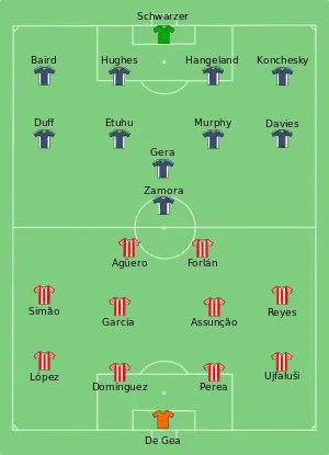 Les mauvais résultats en Ligue des champions ont conduit au licenciement d'Abel Resino et au recrutement de Quique Sánchez Flores comme nouvel entraîneur[178]. En Ligue Europa, après avoir éliminé Galatasaray, l'équipe se qualifie grâce à la règle des buts marqués à l'extérieur face au Sporting Clube de Portugal, au Valence CF et au Liverpool FC, et dispute ainsi sa première finale de catégorie européenne après la Coupe des vainqueurs de coupe de 1986[179]. La finale cette Ligue Europa, disputée le au HSH Nordbank Arena de Hambourg, a vu l'Atlético l'emporter 2-1 face au club londonien Fulham FC, grâce à un doublé de Diego Forlán, le deuxième but étant marqué à la 116e minute. C'est la première fois depuis la Coupe des vainqueurs de coupes de 1962 que l'Atlético de Madrid remporte un titre sur la scène européenne. Durant cette fin de saison, ils atteignent également la finale de la Coupe du Roi en mai mais sont battus par Séville sur le score de 2-0 au Camp Nou à Barcelone.