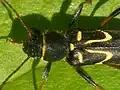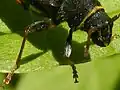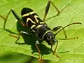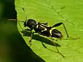 Sa livrée est vespiforme, aux pattes et antennes brunâtres. Ses antennes comptent au moins 11 articles, à l'apex foncé. Son pronotum est presque sphérique, au col orné d'une bande jaune, et la partie postérieure maculée d'un petit point jaune à chaque côté. Son scutellum est maculé d'une tache jaune et hémisphérique. Chaque élytre est également maculé de quatre taches jaunes, soit trois taches formant un carré ouvert dans la partie antérieure, et une longue tache arquée près de la pointe apicale.