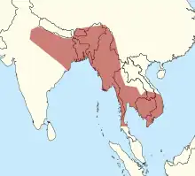 Cette espèce se rencontre en Malaisie péninsulaire, en Thaïlande, au Cambodge, en Viêt Nam, au Laos, en Birmanie, au Bangladesh, au Bhoutan dans le sud de la Chine et en Inde en Assam, au Sikkim, au Bengale-Occidental, en Orissa, au Bihar et en Uttar Pradesh[1].