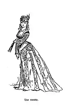 La cocotte fut admirée en même temps que critiquée lorsqu'elle ruinait ses riches amants en dépenses ostentatoires. On l'appelait aussi demi-mondaine, car reçue dans une partie de la société mondaine, courtisane, terme en usage depuis longtemps, belle-petite[1], hétaïre, affirmant du même coup une culture classique, horizontale, reprenant une expression argotique[2]. Les « grandes horizontales » sont la couche la plus riche des cocottes[3].