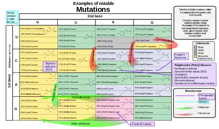 Les mutations faux-sens et les mutations non-sens sont des exemples de mutations ponctuelles, susceptibles de provoquer des maladies génétiques telles que, respectivement, la drépanocytose et la thalassémie[6],[7]. Les mutations faux-sens qui ont un impact physiologique important sont celles qui conduisent à changer la nature physicochimique — par exemple l'encombrement stérique, la nature hydrophile ou hydrophobe, la charge électrique, la nature acide ou basique — d'un résidu d'acide aminé important pour la fonction de la protéine modifiée. Les mutations non-sens conduisent à introduire prématurément un codon-stop dans la séquence de la protéine à transcrire, qui s'en trouve tronquée et donc la fonction physiologique dans les tissus se trouve généralement altérée.