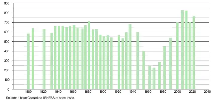 L'évolution du nombre d'habitants est connue à travers les recensements de la population effectués dans la commune depuis 1800. Pour les communes de moins de 10 000 habitants, une enquête de recensement portant sur toute la population est réalisée tous les cinq ans, les populations légales des années intermédiaires étant quant à elles estimées par interpolation ou extrapolation[12]. Pour la commune, le premier recensement exhaustif entrant dans le cadre du nouveau dispositif a été réalisé en 2006[13].