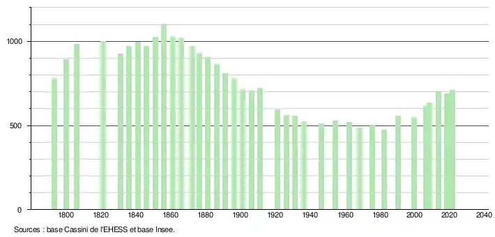 L'évolution du nombre d'habitants est connue à travers les recensements de la population effectués dans la commune depuis 1793. Pour les communes de moins de 10 000 habitants, une enquête de recensement portant sur toute la population est réalisée tous les cinq ans, les populations légales des années intermédiaires étant quant à elles estimées par interpolation ou extrapolation[24]. Pour la commune, le premier recensement exhaustif entrant dans le cadre du nouveau dispositif a été réalisé en 2008[25].