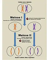 La séparation des chromatides sœurs résulte du clivage de la sous-unité kléisine de la cohésine par l’enzyme séparase. Cette séparation a lieu après une première séparation, celle des chromosomes homologues, qui a également nécessité le clivage de la cohésine. La particularité de la cohésine dans la méiose est qu’elle n’est pas totalement éliminée du premier coup: elle persiste au niveau du centromère et de la région périphérique du centromère (péri-centromère) jusqu’à l’anaphase II avant d’être totalement éliminée des chromosomes.