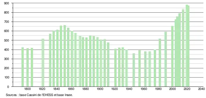 L'évolution du nombre d'habitants est connue à travers les recensements de la population effectués dans la commune depuis 1793. Pour les communes de moins de 10 000 habitants, une enquête de recensement portant sur toute la population est réalisée tous les cinq ans, les populations légales des années intermédiaires étant quant à elles estimées par interpolation ou extrapolation[21]. Pour la commune, le premier recensement exhaustif entrant dans le cadre du nouveau dispositif a été réalisé en 2004[22].