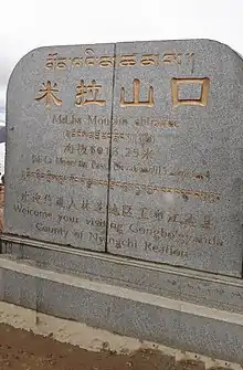 - Photographie du sommet du mont Milha Sur la borne est écrit : « Mt.Milha Welcome to Gonpo Gyamda County Linzhi prefecture Sea level 5020m » / « 米拉山 欢迎您进入林芝地区工布江达县 »
