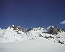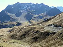 Le col du Lautaret vu depuis le sud dominé par la crête de Chaillol ; sur le versant opposé, la route mène au col du Galibier (à droite, non visible). | ||||