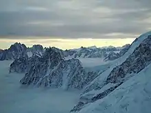 Vue depuis l'aiguille du Midi du col du Midi dominé par le mont Blanc du Tacul ; le refuge des Cosmiques est visible sur les rochers dans le bas de l'image. | ||||