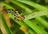 Quand la lutte naturelle ne suffit pas pour la prévention de sévères défoliations, des parasites non-natifs sont introduits. Les deux plus importants sont Agathis pumila et Chrysocharis laricinellae, qui ressemblent aux guêpes européennes. A. pumila se révèle plus efficace en Amérique du Nord dans les années 1930, mais a beaucoup moins de succès dans l'ouest. C. laricinellae, un parasite qui cible uniquement C. laricella a été tenté avec beaucoup plus de succès au Montana, Idaho, Oregon et Washington. Depuis 1960, ces deux espèces, ajoutées à d'autres facteurs naturels ont parasité plus de 90 % des populations dans certaines régions[1], [4],[5].