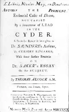 - une année très abondante en pommes, un fermier des environs de Worcester, manquant de « vaisseaux » (tonneaux) pour ramasser son cidre, en remplit provisoirement une grande citerne doublée de plomb (le plomb était assez facilement disponible à cette époque et présentait une grande facilité de mise en œuvre et de soudure. On en faisait notamment des citernes d'eau de pluie, dont on a montré à Amsterdam qu'elles étaient aussi une cause de saturnisme). Ce fermier laissa son cidre entrer en fermentation dans cette cuve, « le temps qu'il se fût procuré des tonneaux ». « Toutes les personnes qui burent de ce cidre furent attaquées de la colique, et le Dr Wall en eut onze à la fois dans son hôpital, Le même médecin avait aussi traité depuis peu trois personnes de cette maladie, occasionnée par du cidre fait dans une presse couverte de plomb »[5].