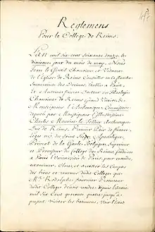 Le collège de Reims fut fondé en par un codicille au testament de Guy de Roye, archevêque de Reims, mort en [4]. Il fut ruiné par les Anglais en . Charles VII, à l'instigation de Renault de Chartres[5], le rétablit en , en le réunissant au collège de Rethel qui en était proche[6].