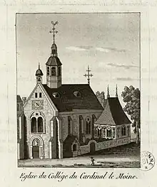 Le légat commença par fonder la chapelle qu'on appela l'autel des paresseux, proche du chœur dans la nef de Notre-Dame de Paris, et en 1303 il acheta aux Augustins l'emplacement qu'ils avaient occupé et y établit un collège qui fut nommé la maison du cardinal, prévu pour cent boursiers, rue Saint-Victor (un des murs jouxtait le collège des Bons-Enfants-Saint-Victor[1]). Le cardinal mourut en 1313 et fut enterré dans la chapelle du collège. Ses parents augmentèrent par de nouveaux dons les revenus et le nombre des boursiers de ce collège qui fut alors appelé le collège du cardinal Lemoine.