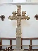 ![]() Cette croix du XIVe siècle a été retrouvée en 1943, enterrée dans le cimetière. Elle a été placée dans le transept sud (à droite quand on regarde le chœur). Elle montre le Christ crucifié, surmonté par deux anges qui portent le soleil et la lune. Sur l'autre côté, on voit la Vierge, couronnée par un ange. La croix est décorée de nombreuses fleurs et d'évocations de pierreries. |