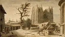 - Première gravure représentant la démolition de la partie est, et seconde gravure représentant une vue d'ensemble depuis le sud de la démolition de la collégiale, réalisées par Olivier de Wismes en 1830.