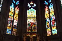 Les trois vitraux du chœur sont exécutés par le peintre-verrier Höner Victor au XIXe siècle. Celui du milieu représente la Lapidation de saint Étienne, et les deux vitraux sur ses côtés, dédoublés, figurent saint Antoine, saint Vincent de Paul, saint Pierre et saint Paul[14].