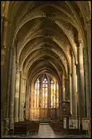 Élevé vers 1200-1220, le chœur occidental, ou westbau, présente des caractéristiques d'influence rhénane. Il est de style transition entre le roman et le gothique et se compose du narthex couronné d'un clocher octogonal et prolongé par une abside semi-circulaire couronnée d'une galerie de circulation couverte dont les petites arcades en plein cintre reposent sur des colonnettes. Il a été fortement restauré au XIXe siècle par l'architecte Jean-Charles Delsaux et sert actuellement de baptistère. Le reste de l'édifice est de style gothique. Le chœur oriental et son abside sont datés de 1255, le transept et les deux premières travées orientales de la nef de 1283-1287, les deux dernières travées de la nef de 1332. Au XVe siècle, des chapelles furent insérées entre les contreforts des bas-côtés.