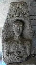 | Un homme vêtu d'une tunique et d'un manteau à capuchon. | n.c. | Époque gallo-romaine | Pierre | n.c. | Dépôt de la Salsa en 1963, provenance : Corre | Salle Barbey | [1] | |
