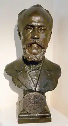 Buste de Jean-Léon Gérôme polychromant une Tanagra | Léopold Bernstamm | 1897 | Bronze patiné brun, fonte Siot-Decauville | h. 76 cm | Dépôt de l’État en 1949 | Salle Gérôme | [1],[12] |