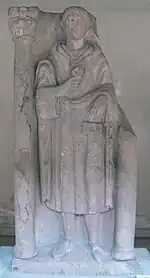 | Le défunt tient un volumen dans sa main droite. | n.c. | Époque gallo-romaine | Pierre | n.c. | Dépôt de la Salsa en 1963, provenance : Corre | Salle Barbey | [1] | |