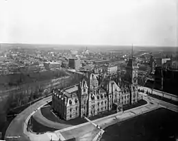 En 1855, la ville est renommée Ottawa et accède, en 1857 au statut de capitale de la province du Canada. La construction des édifices parlementaires autour d'une vaste esplanade (un immeuble pour le corps législatif au nord et deux édifices administratifs à l'est et à l'ouest) débute dès 1859 sur la colline, puis s'appelle la Colline du Parlement.