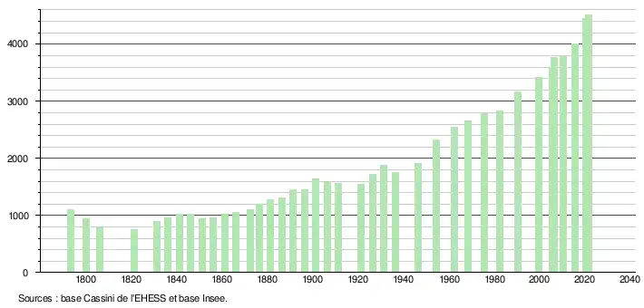L'évolution du nombre d'habitants est connue à travers les recensements de la population effectués dans la commune depuis 1793. Pour les communes de moins de 10 000 habitants, une enquête de recensement portant sur toute la population est réalisée tous les cinq ans, les populations légales des années intermédiaires étant quant à elles estimées par interpolation ou extrapolation[21]. Pour la commune, le premier recensement exhaustif entrant dans le cadre du nouveau dispositif a été réalisé en 2005[22].
