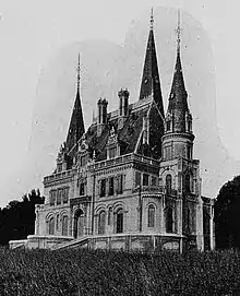- la Pelonnière (1804) : de la construction d'origine également baptisée « Ermitage du Mont d'Or » ou « Folie Guillaud », du nom de son commanditaire, il reste un grand bâtiment mansardé, une colonne torsadée sommée de la statue de Marc Aurèle, une arche en blocs de tuf et un obélisque en pierre ocre et brique. Par arrêté du ont été classés au titre des monuments historiques[27] "le jardin et toutes les parcelles sur lesquelles il se trouve, le réseau hydraulique, le mur de clôture, l'ensemble des stations conservées, les mouvements de terre, terrassements et vestiges maçonnés, la chapelle domestique et son décor, les ruines d'une ancienne chapelle, la serre, le portail d'accès, ainsi que tous les vestiges à découvrir."[28]