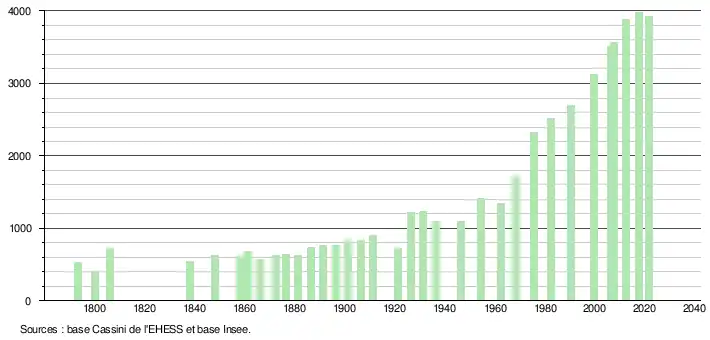 L'évolution du nombre d'habitants est connue à travers les recensements de la population effectués dans la commune depuis 1793. Pour les communes de moins de 10 000 habitants, une enquête de recensement portant sur toute la population est réalisée tous les cinq ans, les populations légales des années intermédiaires étant quant à elles estimées par interpolation ou extrapolation[22]. Pour la commune, le premier recensement exhaustif entrant dans le cadre du nouveau dispositif a été réalisé en 2007[23].