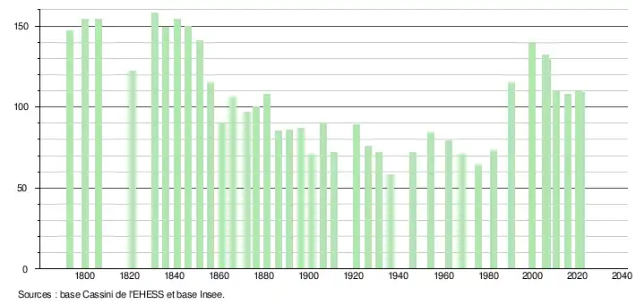 L'évolution du nombre d'habitants est connue à travers les recensements de la population effectués dans la commune depuis 1793. Pour les communes de moins de 10 000 habitants, une enquête de recensement portant sur toute la population est réalisée tous les cinq ans, les populations légales des années intermédiaires étant quant à elles estimées par interpolation ou extrapolation[19]. Pour la commune, le premier recensement exhaustif entrant dans le cadre du nouveau dispositif a été réalisé en 2005[20].