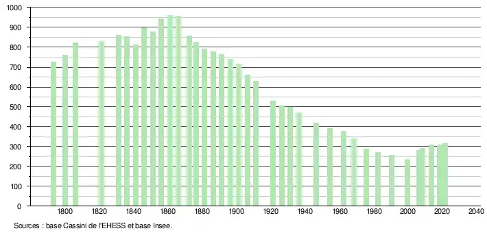 L'évolution du nombre d'habitants est connue à travers les recensements de la population effectués dans la commune depuis 1793. Pour les communes de moins de 10 000 habitants, une enquête de recensement portant sur toute la population est réalisée tous les cinq ans, les populations légales des années intermédiaires étant quant à elles estimées par interpolation ou extrapolation[16]. Pour la commune, le premier recensement exhaustif entrant dans le cadre du nouveau dispositif a été réalisé en 2008[17].