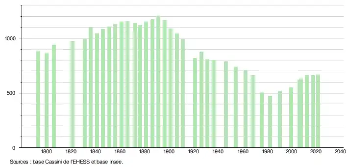 L'évolution du nombre d'habitants est connue à travers les recensements de la population effectués dans la commune depuis 1793. Pour les communes de moins de 10 000 habitants, une enquête de recensement portant sur toute la population est réalisée tous les cinq ans, les populations légales des années intermédiaires étant quant à elles estimées par interpolation ou extrapolation[17]. Pour la commune, le premier recensement exhaustif entrant dans le cadre du nouveau dispositif a été réalisé en 2007[18].