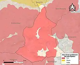 Les mouvements de terrains susceptibles de se produire sur la commune sont des tassements différentiels[38]. Le retrait-gonflement des sols argileux est susceptible d'engendrer des dommages importants aux bâtiments en cas d’alternance de périodes de sécheresse et de pluie[39]. 87,5 % de la superficie communale est en aléa moyen ou fort (58,6 % au niveau départemental et 48,5 % au niveau national métropolitain)[Carte 4]. Depuis le , en application de la loi ÉLAN, différentes contraintes s'imposent aux vendeurs, maîtres d'ouvrages ou constructeurs de biens situés dans une zone classée en aléa moyen ou fort[Note 5],[40].