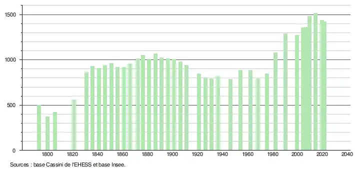 L'évolution du nombre d'habitants est connue à travers les recensements de la population effectués dans la commune depuis 1793. Pour les communes de moins de 10 000 habitants, une enquête de recensement portant sur toute la population est réalisée tous les cinq ans, les populations légales des années intermédiaires étant quant à elles estimées par interpolation ou extrapolation[27]. Pour la commune, le premier recensement exhaustif entrant dans le cadre du nouveau dispositif a été réalisé en 2004[28].