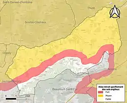 Les mouvements de terrains susceptibles de se produire sur la commune sont des affaissements et effondrements liés aux cavités souterraines (hors mines) et des tassements différentiels[21]. Afin de mieux appréhender le risque d’affaissement de terrain, un inventaire national permet de localiser les éventuelles cavités souterraines sur la commune[22]. Le retrait-gonflement des sols argileux est susceptible d'engendrer des dommages importants aux bâtiments en cas d’alternance de périodes de sécheresse et de pluie[23]. 80,1 % de la superficie communale est en aléa moyen ou fort (79,5 % au niveau départemental et 48,5 % au niveau national)[Carte 2]. Depuis le , en application de la loi ÉLAN, différentes contraintes s'imposent aux vendeurs, maîtres d'ouvrages ou constructeurs de biens situés dans une zone classée en aléa moyen ou fort[Note 4],[24].