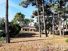 La colonie du Pylône est une maison bourgeoise de 180 m2[1] édifiée au début des années 1920 à l'extrémité nord de la rue de la Poste[alpha 1], dans un endroit tout à la fois calme et proche du centre de Mimizan-Plage, au pied de la dune et en lisière de la forêt domaniale, à l'emplacement d'un ancien pylône de chasse à la tourterelle qui lui laissera son nom. De style Île-de-France, elle est dotée d'une entrées parée d'un perron à double escalier[2].