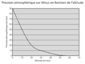 - la pression atmosphérique à la surface est environ 90 fois celle de la Terre, soit, sur Terre, la pression ressentie à environ 1 km au-dessous du niveau de la mer. Ces conditions font que la durée de vie des sondes spatiales qui parviennent à la surface est extrêmement brève : les sondes Venera 5 et Venera 6 par exemple ont été écrasées par la pression à 18 kilomètres au-dessus de la surface. Les sondes suivantes, Venera 7 et Venera 8 réussirent à transmettre après avoir atteint la surface, mais ces transmissions étaient très brèves, ne fonctionnant pas plus d'une heure dans la brûlante atmosphère corrosive. L'accès aux matériaux de la surface à l'usage d'une colonie située dans la haute atmosphère serait un problème ;