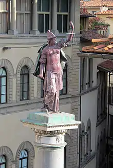 La consécration de cette colonne, érigée par Cosme Ier de Médicis, a changé plusieurs fois. Cosme l'avait prévu d'abord pour célébrer sa victoire de 1537 sur Sienne dans la Bataille de Montemurlo (d'autres citent la Bataille de Marciano). En 1569, le Pape Pie V avait accordé à Cosme le titre de Grand-Duc de Toscane, et la dédicace avait été faite à la justice avec la présente inscription[2].