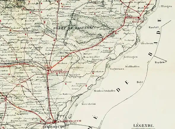 Pour le responsable de la topographie romaine à la Société pour la conservation des monuments historiques d'Alsace, le colonel Charles-Gabriel Beaudet de Morlet, qui prospecte autour de la voie romaine reliant Brumath à Seltz (Saletio), « la tradition et les monuments romains trouvés le long du tracé présumé fournissent des preuves suffisantes pour admettre ce tracé ».