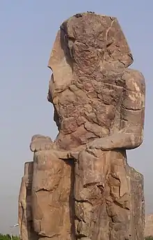 Le colosse Nord, de droite lorsqu'on leur fait face, et dont parlent les auteurs anciens en tant que Memnon, est celui qui se fissura et s'effondra en partie, à la suite du tremblement de terre de l'an 27 avant notre ère[2].