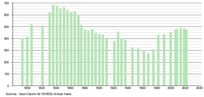 L'évolution du nombre d'habitants est connue à travers les recensements de la population effectués dans la commune depuis 1793. Pour les communes de moins de 10 000 habitants, une enquête de recensement portant sur toute la population est réalisée tous les cinq ans, les populations légales des années intermédiaires étant quant à elles estimées par interpolation ou extrapolation[19]. Pour la commune, le premier recensement exhaustif entrant dans le cadre du nouveau dispositif a été réalisé en 2008[20].