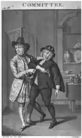 D'autres techniques sont employées pour enrichir le répertoire du moment. L'imitation de la comédie espagnole et des « novelas » apporte aux pièces de l'animation et de la nouveauté[90]. De ces premiers efforts, naissent en 1662 The Committee, une comédie politique de Robert Howard, où deux couples royalistes exemplaires récupèrent leurs biens confisqués par des Puritains malhonnêtes[91], et une tragi-comédie, The Adventures of Five Hours, adaptation par sir Samuel Tuke de la pièce Los Empeños de Seis Horas, que l'on croyait alors écrite par Calderón et qui est aujourd'hui attribuée à Antonio Coello. Cette dernière pièce eut un succès énorme et Pepys en fait un éloge dithyrambique dans son Journal[92],[93], la jugeant même supérieure à Othello[94]. Dryden, pourtant peu doué pour la comédie, commence sa carrière de dramaturge par The Wild Gallant (1663), une comédie des humeurs, à l'intrigue confuse, fortement inspirée par Jonson[95],[96], où la recherche d'un mari par Isabella est le moteur principal de l'action.