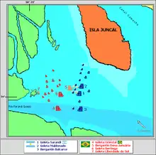 - L’escadre impériale brésilienne était forte de dix-sept navires : un brigantin, onze goélettes et cinq canonnières. Le capitaine Jacinto Roque de Sena Pereira commandait le navire-amiral, la goélette L’Orientale ; le brigantin La Dona Januária était sous le commandement de Pedro Antonio Carvalho ; les autres goélettes étaient la Bertioga (lieutenant George Broom), Liberdade do Sul (lieutenant Augusto Venceslau da Silva Lisboa), 12 de Outubro, Fortuna (qui servait de navire-hôpital)[note 7] Vitoria de Colonia, Itapoã (lieutenant Germano Máximo de Souza Aranha), 7 de Março, Brocoió (lieutenant Francisco de Paula Osório), 9 de Janeiro et 7 de Setembro; à ces vaisseaux il faut ajouter deux canonnières de type goélette (gun schooner), la Atrevida et le Paraty ainsi que les canonnières Cananéia, Paranaguá et Iguapé. En tout la flotte brésilienne disposait d’environ 65 pièces d’artillerie et de 750 hommes. Pour la première et la dernière fois au cours de cette guerre, les forces en présence étaient sensiblement équivalentes, ou du moins l’avantage des brésiliens n’était-il pas écrasant[14].